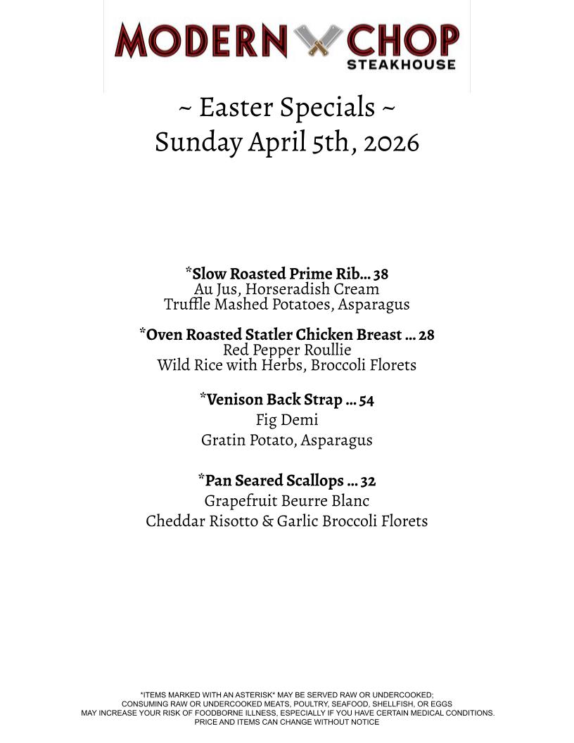 Great food, service and atmosphere! We recommend securing early reservations . You don't want to miss a holiday family gathering around the Modern Chop Table.